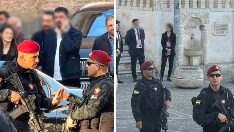 Ziyarette Barzani’yi ‘korumak amacıyla’ silahlı ve Irak Kürt Bölgesel Yönetimi (IKBY) üniformalı askerlerin de yer aldığı görüldü.