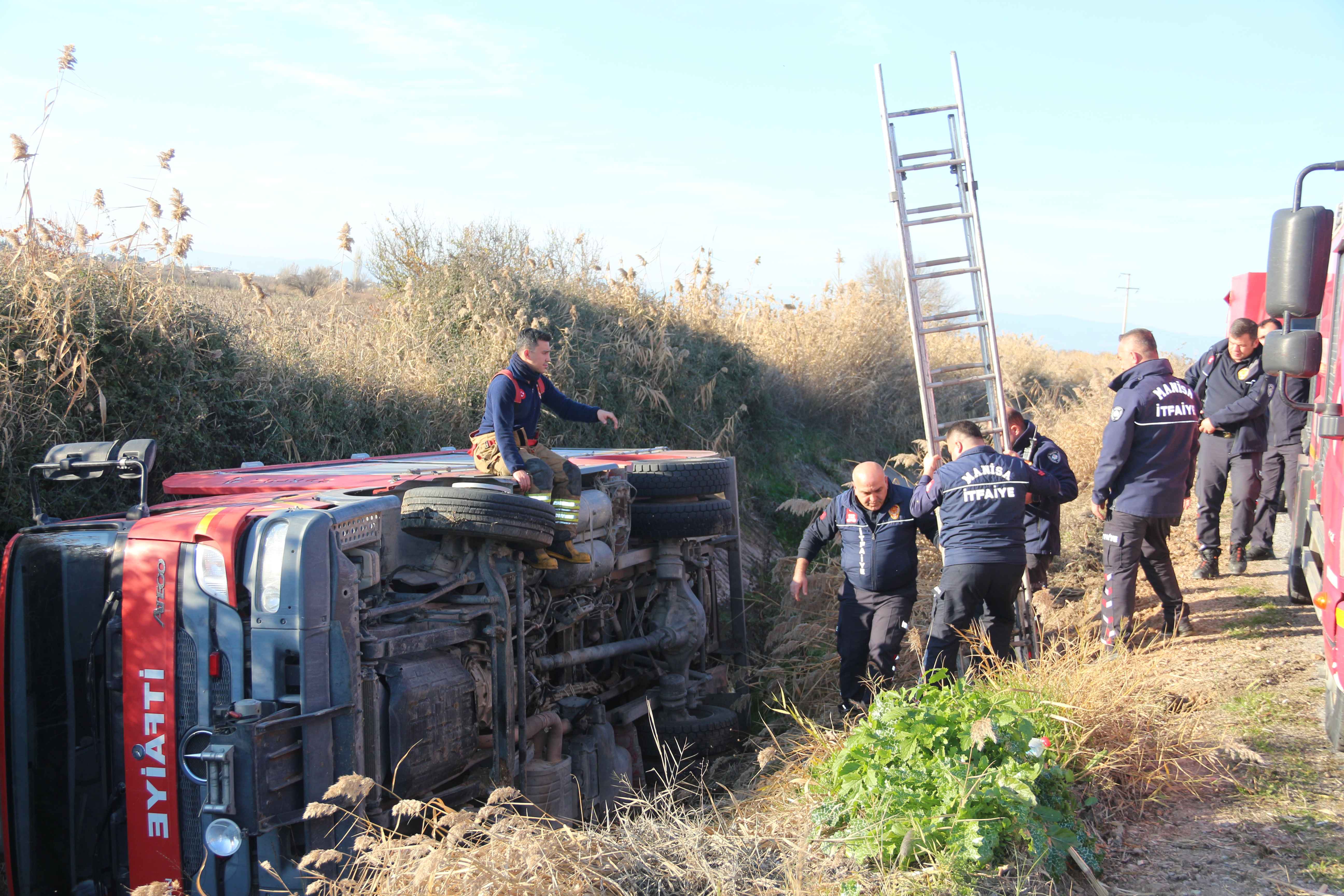 112 Acil Çağrı Merkezine yapılan otluk yangını ihbarını değerlendirmek için herekete geçen Manisa Büyükşehir Belediyesi İtfaiye aracı, Hacırahmanlı Mahallesi yakınlarında su kanalına devrildi.