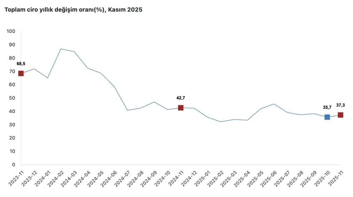 TÜİK tarafından yapılan açıklamaya göre, Kasım 2025 döneminde ciro endekslerinde olumlu bir artış gözlendi. Mevsim ve takvim etkisinden arındırılmış toplam ciro endeksi, bir önceki aya göre yüzde 3,7 artarak yükseldi.